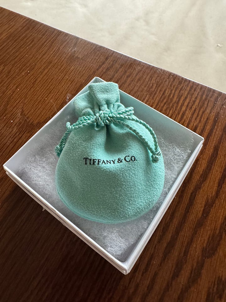 Then, on Poshmark, I saw that someone in California was selling this very charm, complete in its Tiffany-blue velvet bag. Pictures showed it looking like new. The price wasn’t exactly low, but reasonable. I didn’t hesitate. I clicked on “add to cart,” telling myself it was a birthday-Christmas present to myself.