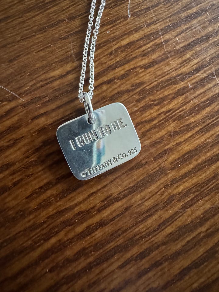 This time, the way I’m holding the chain apparently is a problem. Because just as I’m about to place it into the pocket, the necklace’s charm—a Tiffany & Co. small, sterling silver square with the words “I Run to Be” engraved on one side, “NWM” for Nike Women’s Marathon on the other—slides off into the soft sand.